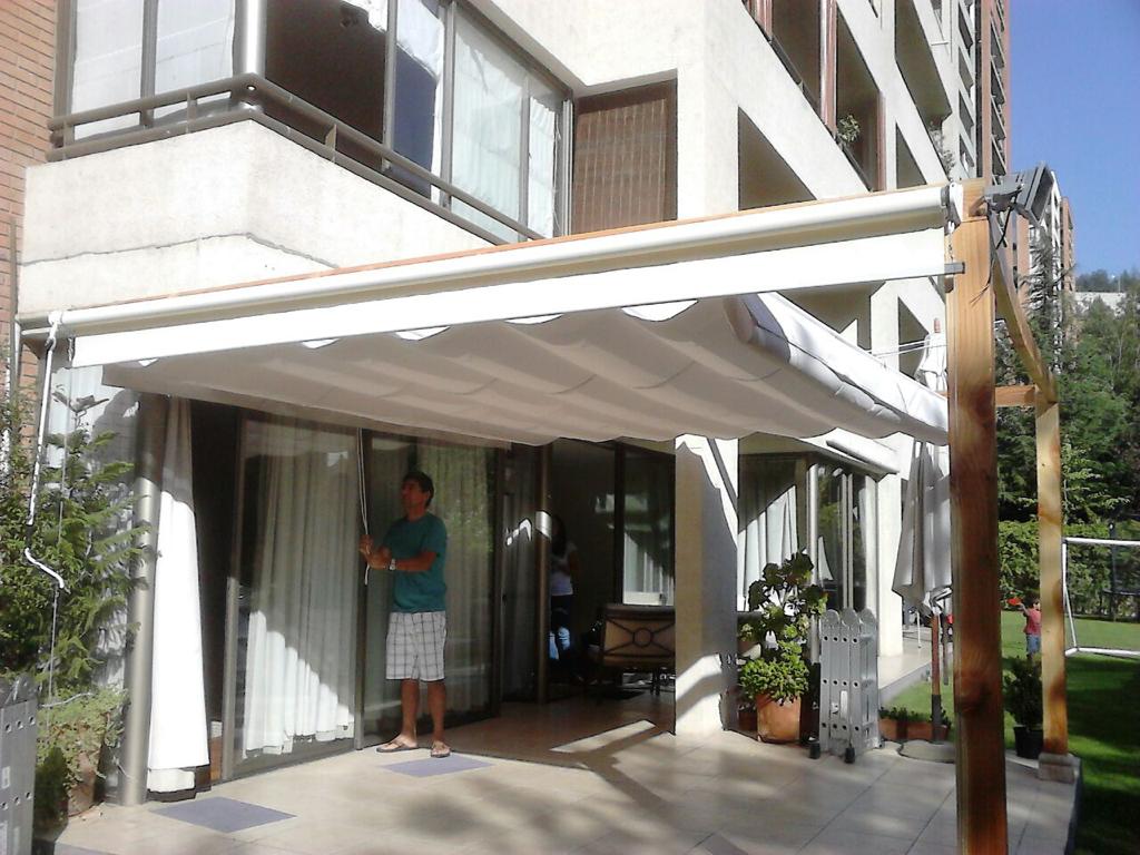 Toldos retráctiles o proyectantes confeccionados a medida, pueden ser con manivela o motorizados.
